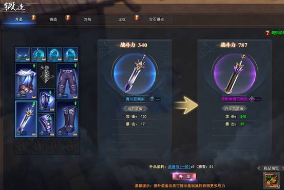 不同于其他传统游戏打怪几率掉落各种装备,玩家可在早期主线任务中获取到全套基础装备,通过武器石,防具石,首饰石对不同基础装备进行升品,将基础装备逐渐提升至终极品质准备,摒弃了传统游戏中为了获得一件极品装备而不停刷怪刷boss的装备系统,让玩家可以更容易获取到顶级装备。