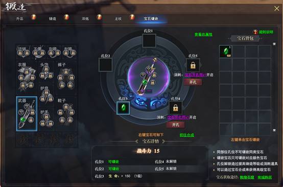 每个部位的装备都可以进行宝石镶嵌,不同部位的装备所拥有的宝石孔位数也不同,铸造等级越高开启的孔位越多。