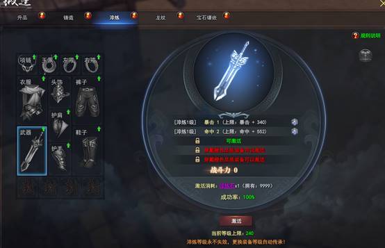 每个部位的装备都可进行淬炼,通过装备升品可以开启更多可激活淬炼属性,通过消耗淬炼石激活淬炼属性,并根据装备部位随机获得一个相应的随机属性。