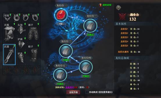 每个部位的装备都各自拥有五个龙纹位,不同部位装备的龙纹位拥有不同的属性,通过消耗龙纹碎片可以对龙纹位进行激活、升级,也可以使用相应级别的龙纹石对龙纹位进行激活。